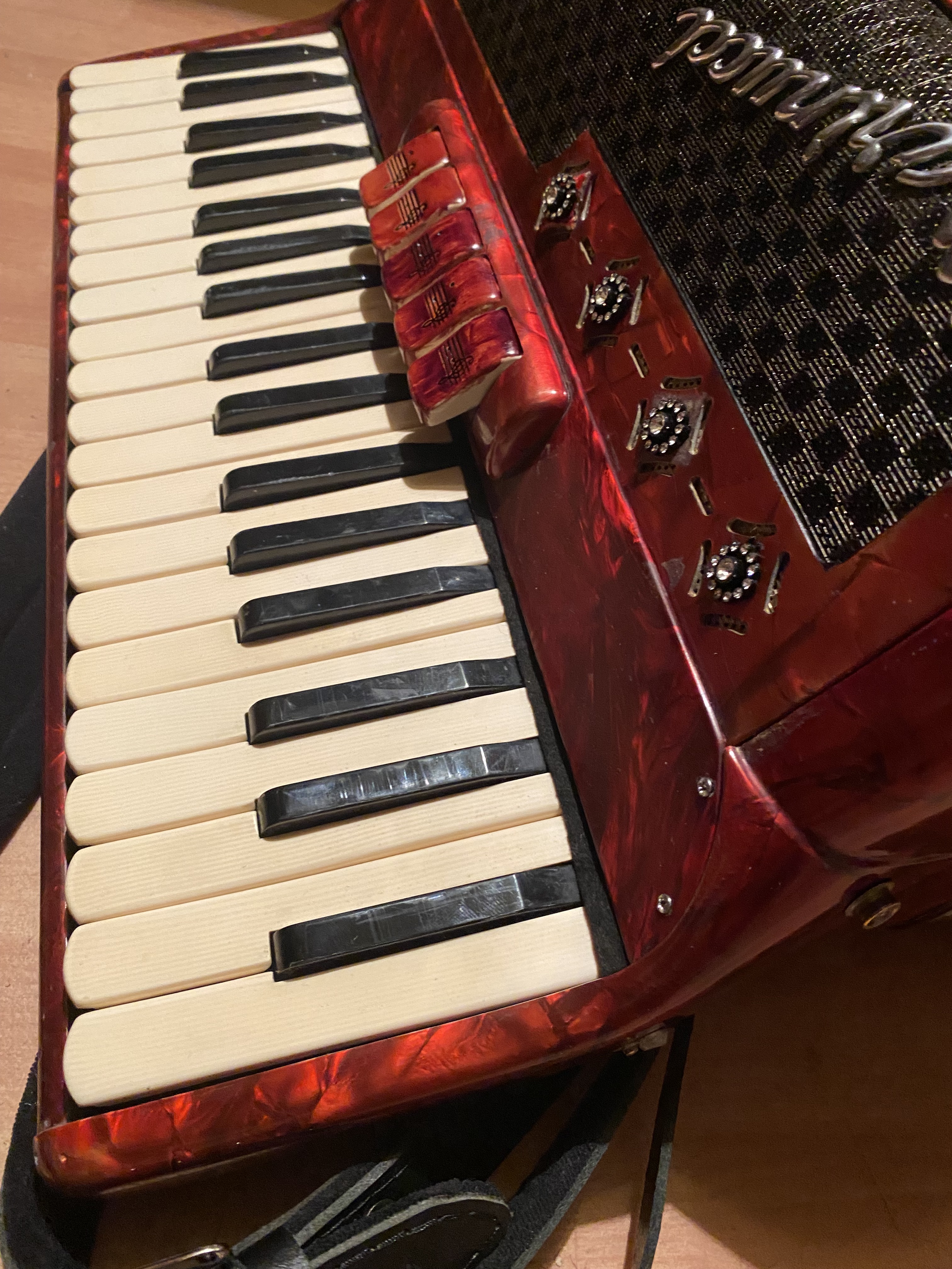Profi Piano-Akkordeon in massivem Kirschholz-Gehäuse, Holzkerntastatur, a-mano |