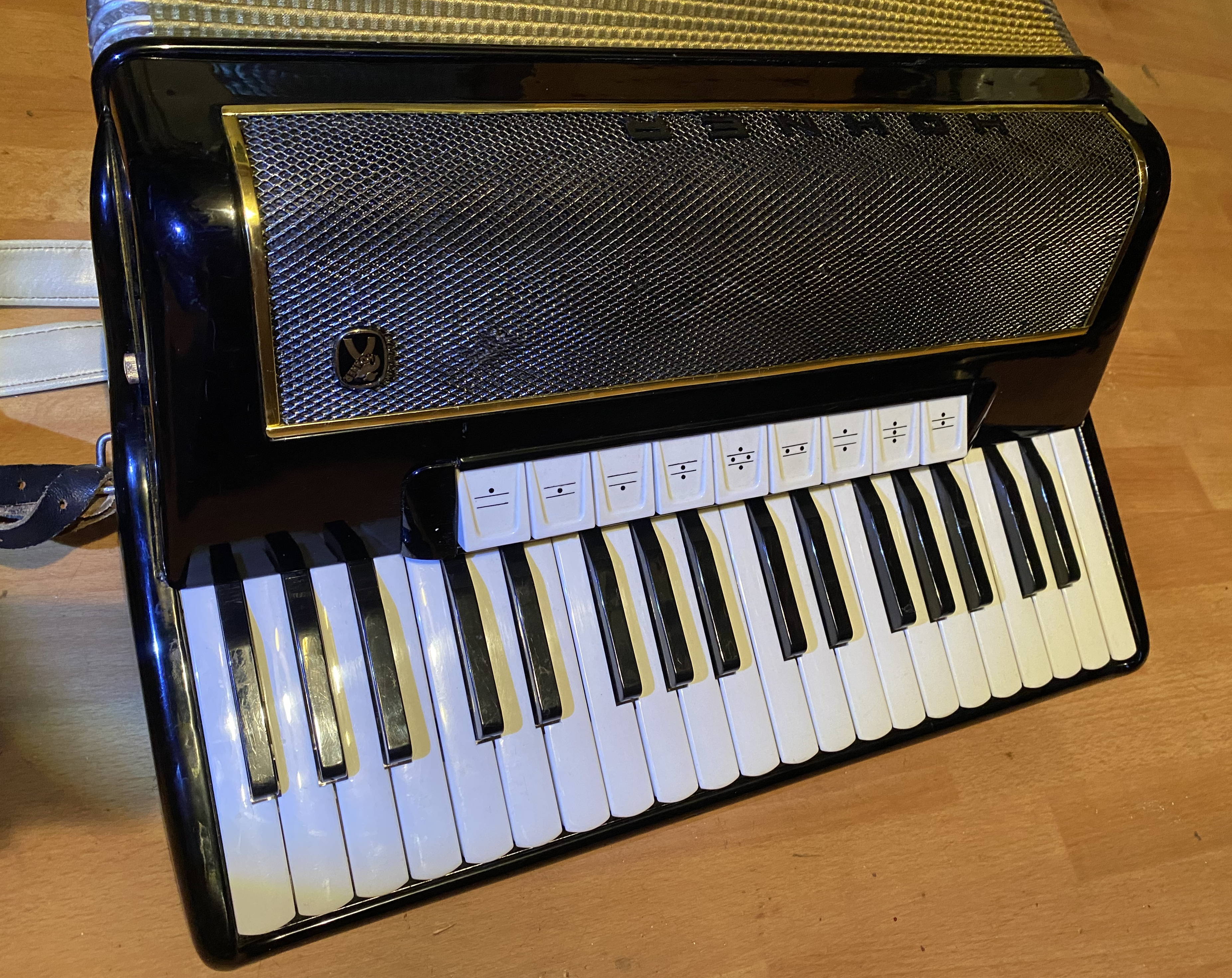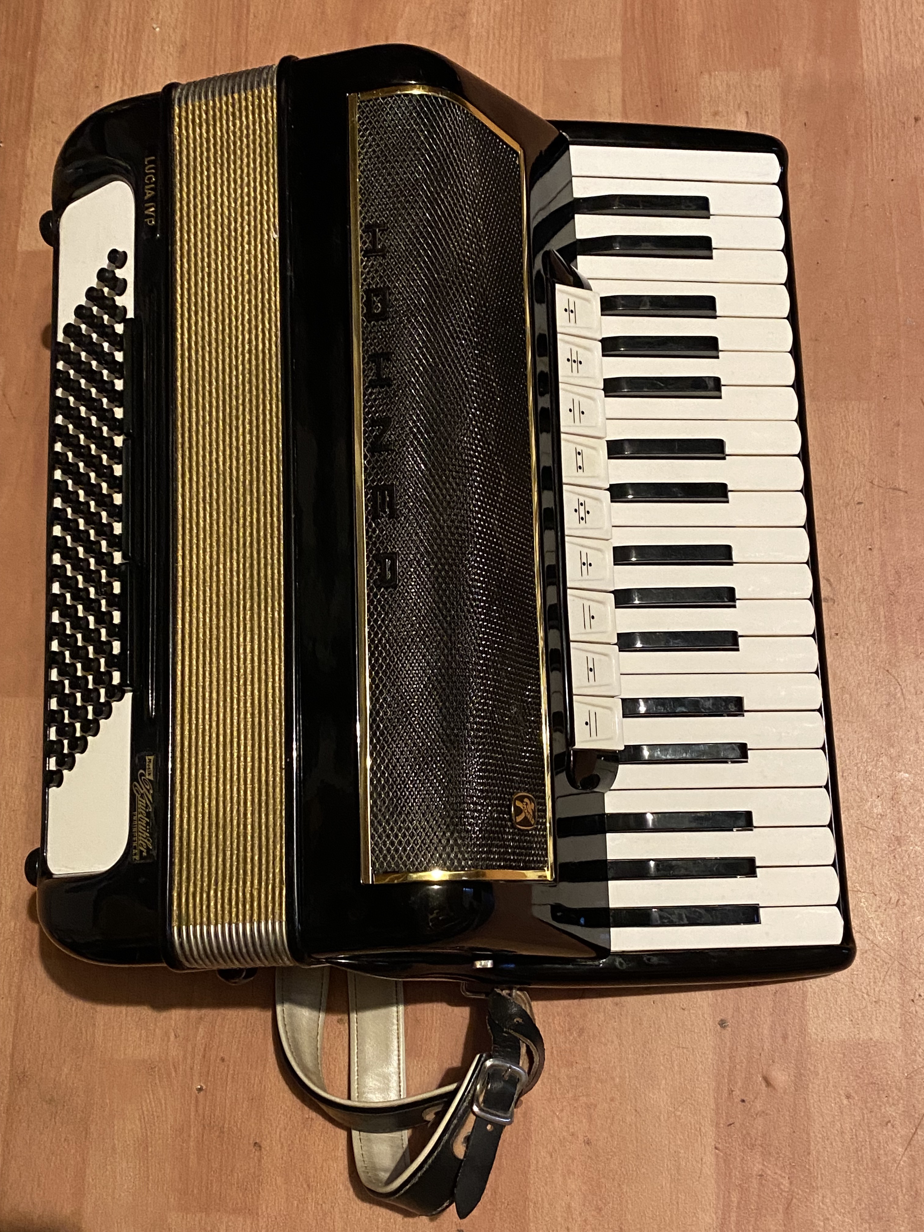 | Piano-Musette, F-f, 37 Töne F-f, Holzkern-Tasten 4-chörig Musette, 96 Bässe 5-chöriger Bass |