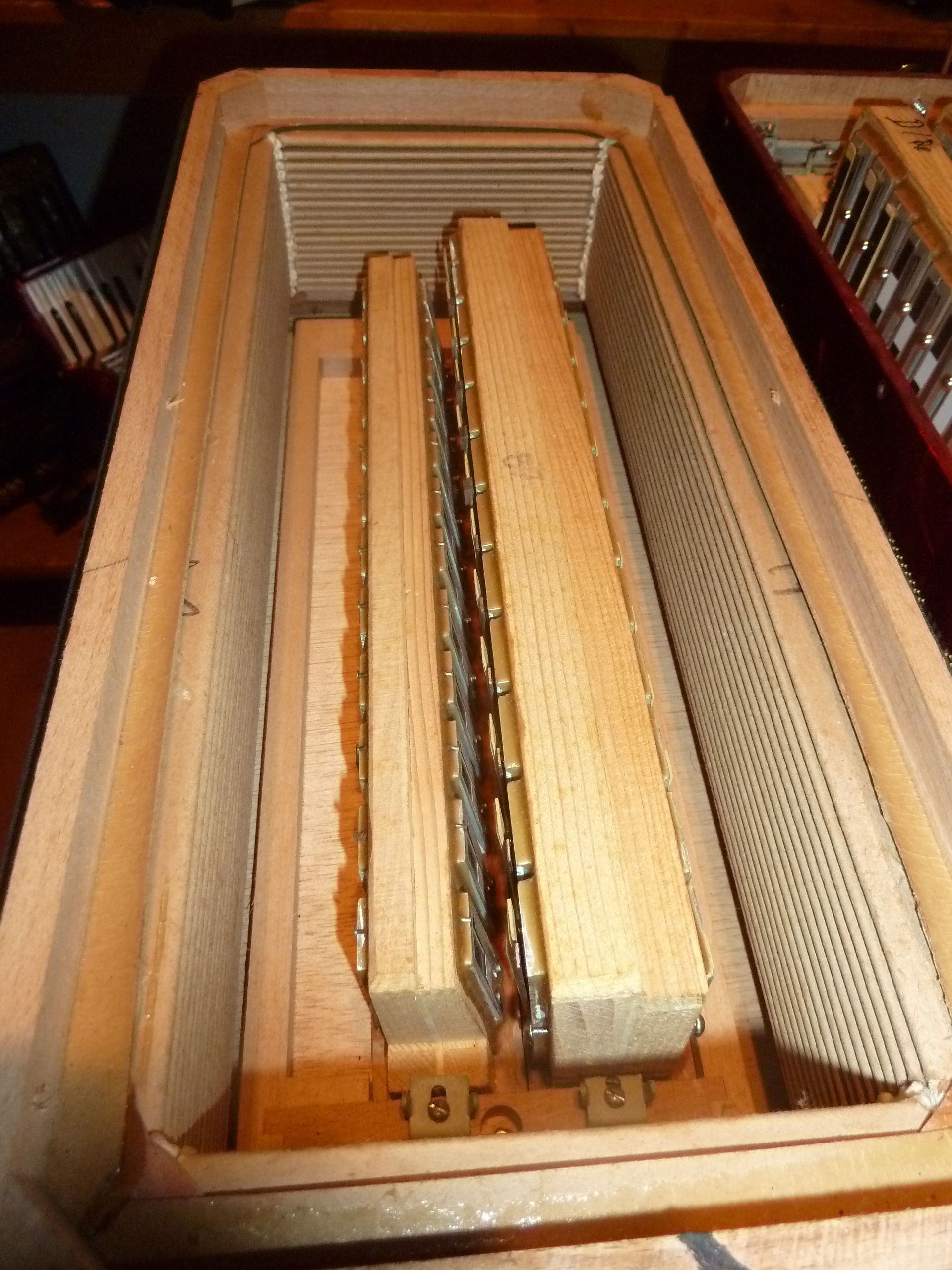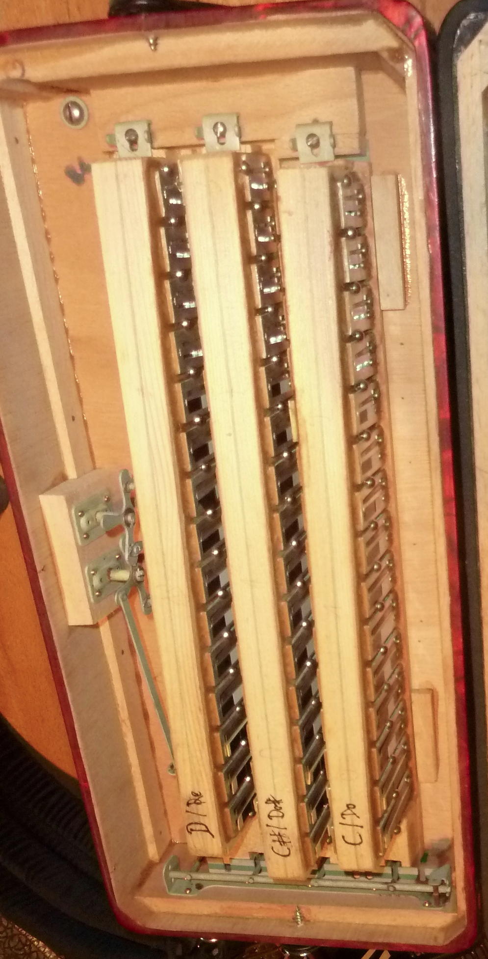 italienisches Knopf-Akkordeon C-Griff, Cassotto Edelholz-massiv Ahorn, kein Sperrholz oder Furnier, Stimmzungen a-mano (d.h., mit blauen Seitenkanten) |